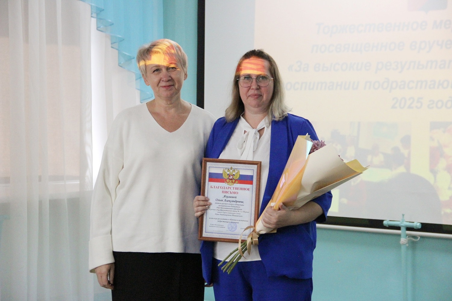 Заместитель главы Облученского района по социальным вопросам Светлана Паршина выразила признательность педагогам школ и детских садов района за их самоотверженный и приносящий плоды труд, вручив заслуженные награды Бессарабовой Татьяне Алексеевне и Якимовой Ольге Александровне.