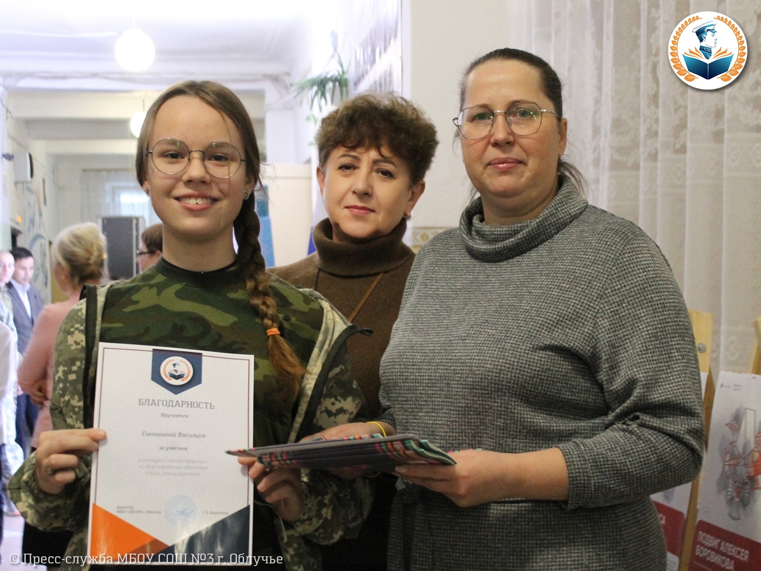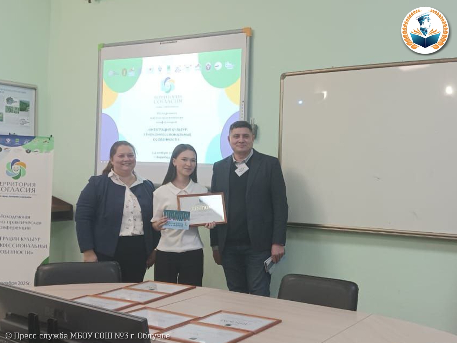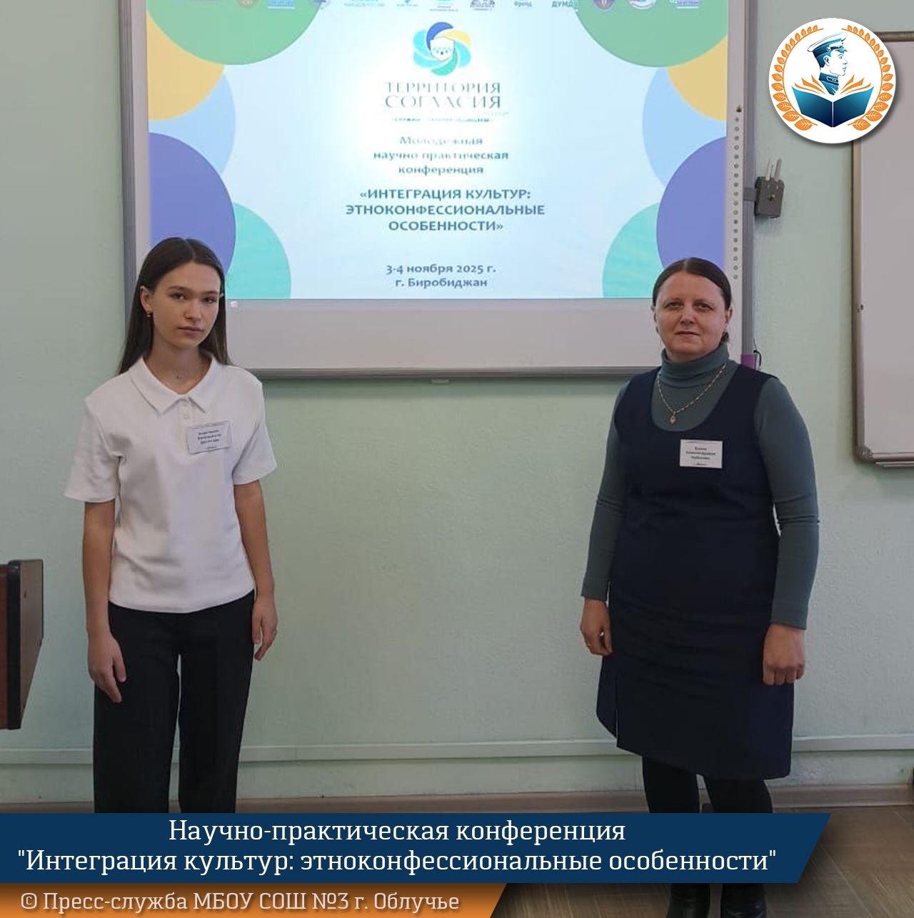 Ученица 10 класса нашей школы Анастасия Денисова и ее научный руководитель, учитель истории и обществознания Елена Александровна Набокова приняли участие в этой конференции. Мероприятие прошло в рамках Дальневосточного этноконфессионального форума «Территория согласия» и было приурочено к значимым государственным событиям — Году Защитника Отечества и Дню народного единства.