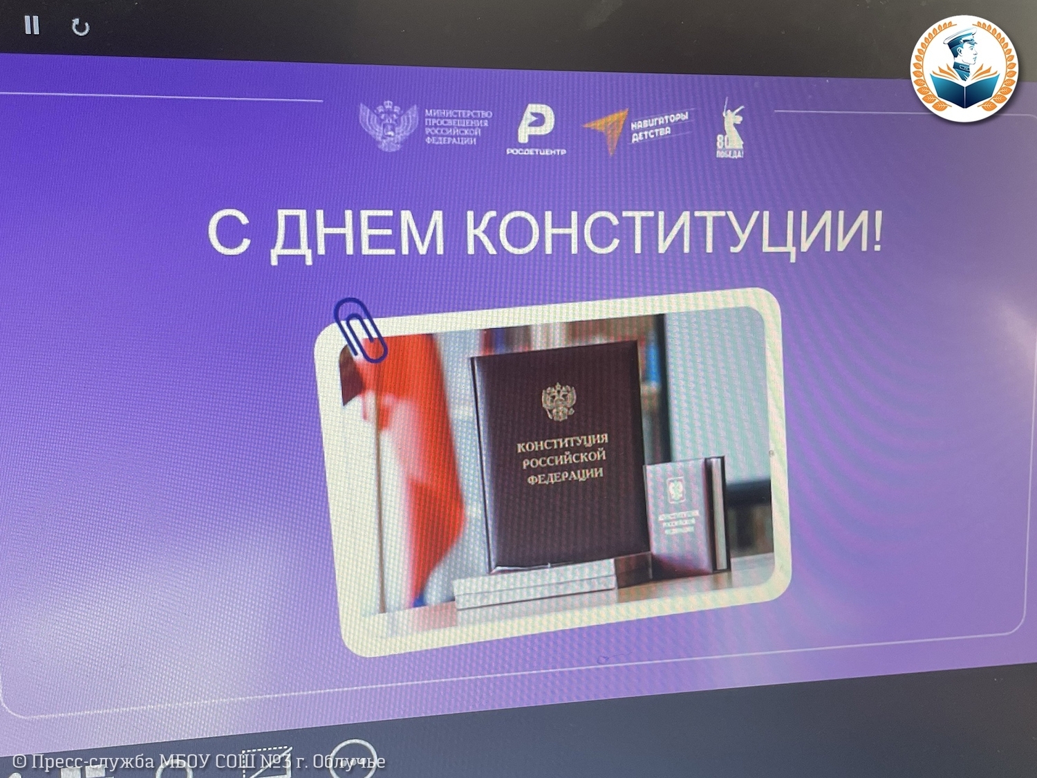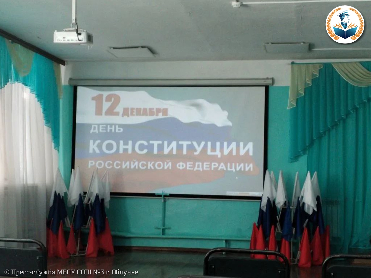 По традиции понедельник в МБОУ СОШ №3 г. Облучье начался с торжественного поднятия флага и исполнения гимна Российской Федерации. Для учащихся был проведен классный час «Закон и справедливость» приуроченные к Конституции Российской Федерации.