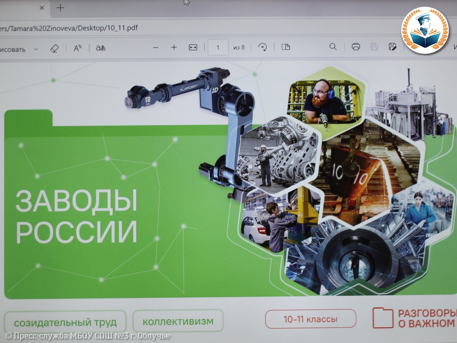 Современная промышленность, как выяснилось, развеяла стереотипы о пыльных цехах. На занятии показали кадры первого в России «Завода роботов» в Челябинске, где собирают промышленных роботов Rus Robot, и рассказали о
