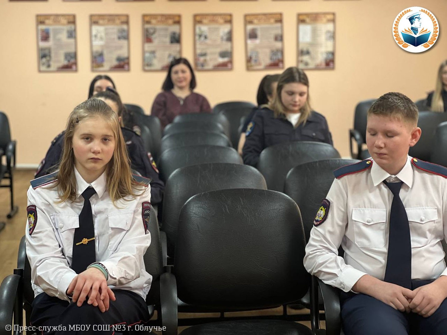 Сегодня старший инспектор по делам несовершеннолетних Елена Прокопенко рассказала кадетам об особенностях своей работы. Кадровый сотрудник младший лейтенант полиции Ульяна Ульянова показала ребятам фильм об истории форменного костюма сотрудников полиции.
