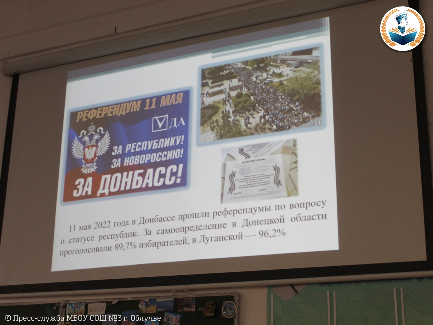 По традиции, понедельник в МБОУ СОШ №3 г. Облучье начался с торжественного поднятия флага и исполнения гимна Российской Федерации. Для учащихся был проведен классный час «Разговоры о важном» на тему «День воссоединения ДНР, ЛНР и России».