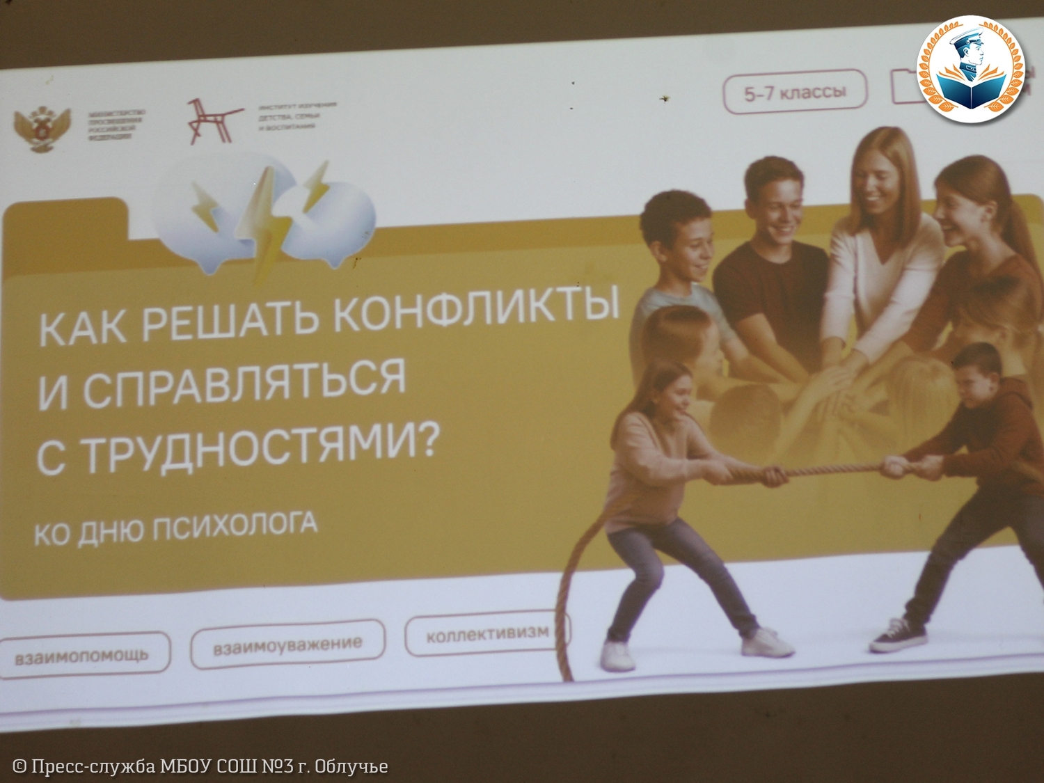 По традиции, понедельник в МБОУ СОШ №3 г. Облучье начался с торжественного поднятия флага и исполнения гимна Российской Федерации. Для учащихся был проведен классный час «Разговоры о важном» на тему «Как решать конфликты и справляться с трудностями? Ко Дню психолога».