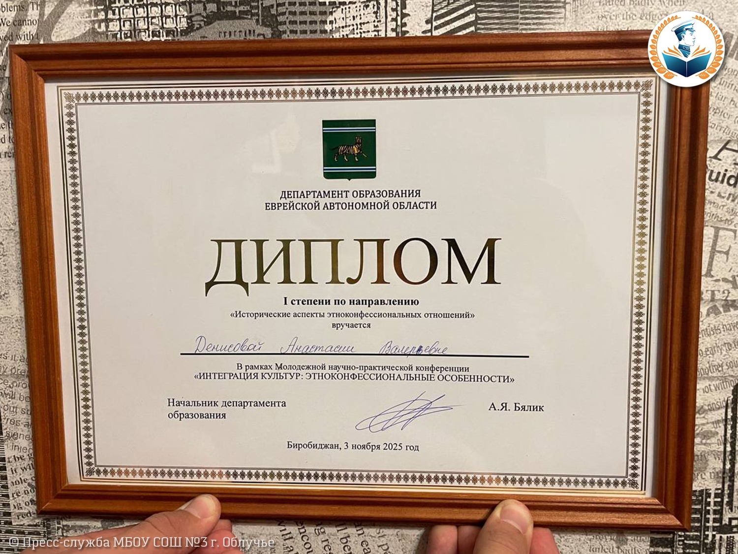 Анастасия Денисова представила свою исследовательскую работу в секции «Исторические аспекты этноконфессиональных отношений». Высокий уровень подготовки, глубина исследования и блестящая защита работы были по достоинству оценены членами жюри. Анастасия получила диплом I степени, который вручил лично начальник департамента образования Еврейской автономной области А. Я. Бялик