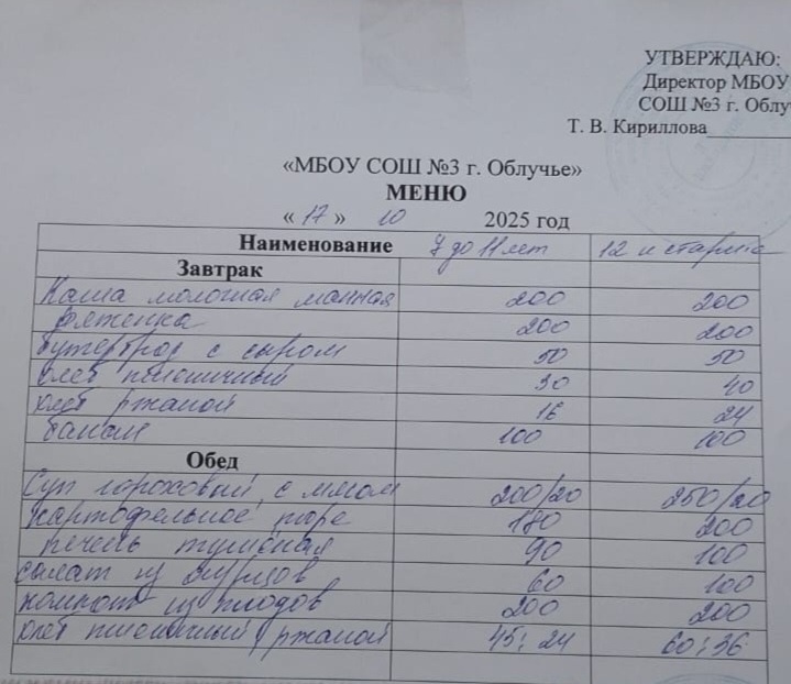 Сведения об организаторе питания: МБОУ СОШ № 3 г.Облучье